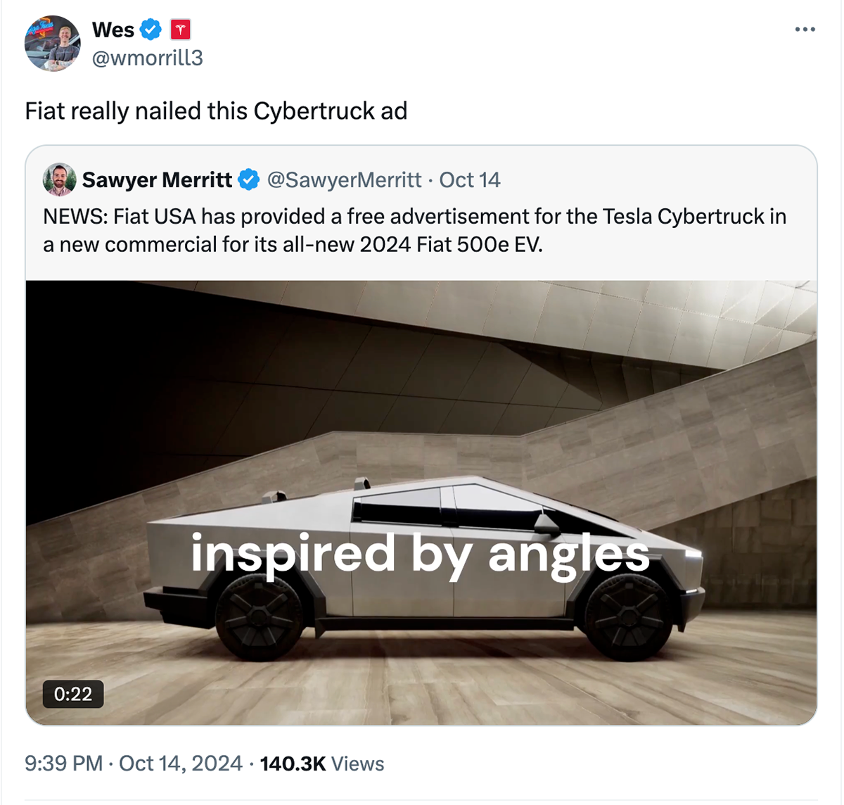 Whether they loved or hated it, people couldn't stop talking about the FIAT 500e. CYBERTRUCK's lead engineer, Wes Morrill, even had something to say about the spot.
