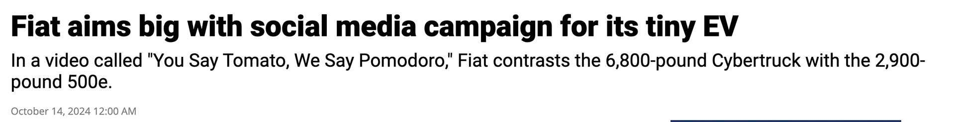 When crafting these spots, our intention wasn't to disparage the CYBERTRUCK in any way. More so, we wanted to highlight that EV's come in all shapes, sizes, and prices by celebrating the differences of the two vehicles while showcasing the 500e's exquisite Italian design and affordable price.